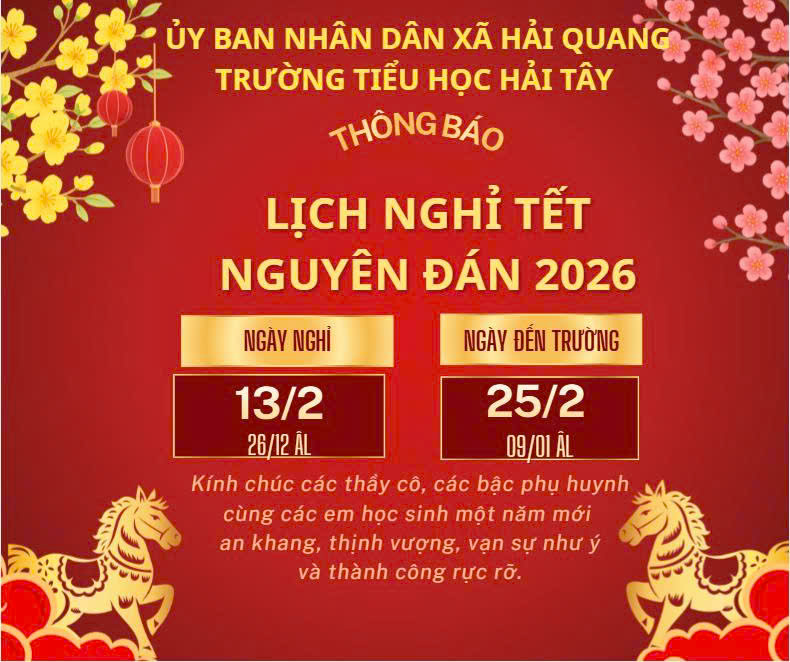 Trong không khí hân hoan chào đón mùa Xuân mới, Trường Tiểu học Hải Tây trân trọng thông báo tới Quý phụ huynh và các em học sinh lịch nghỉ Tết Nguyên đán Bính Ngọ năm 2026.
