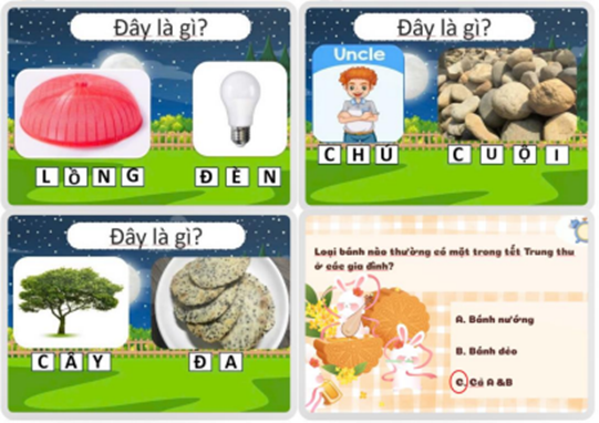 Không khí học tập trở nên sôi nổi hơn với phần đố vui – đuổi hình bắt chữ chủ đề Trung thu. Những câu hỏi và hình ảnh dí dỏm giúp các em vừa học, vừa chơi, vừa khắc sâu thêm kiến thức.